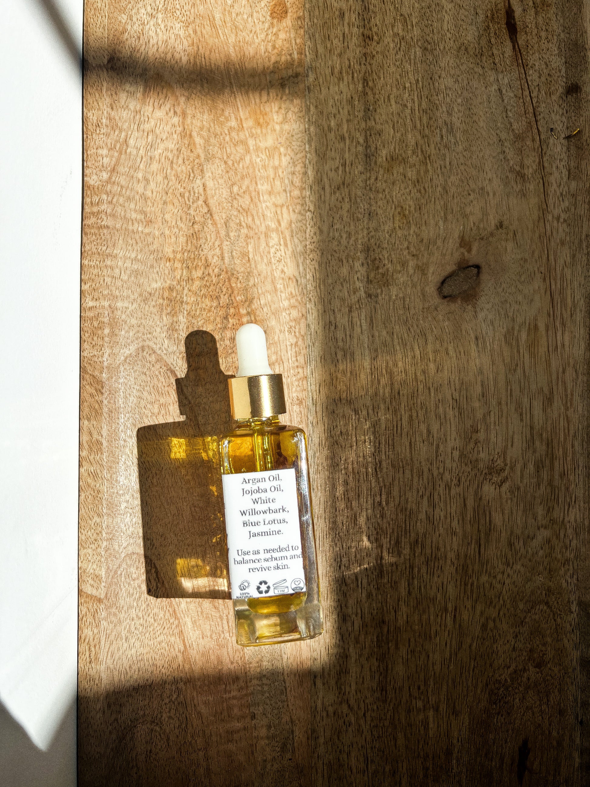 Organic cold pressed Argan & jojoba oil, organic herb blend (white willowbark, Blue Lotus Flower, jasmine).