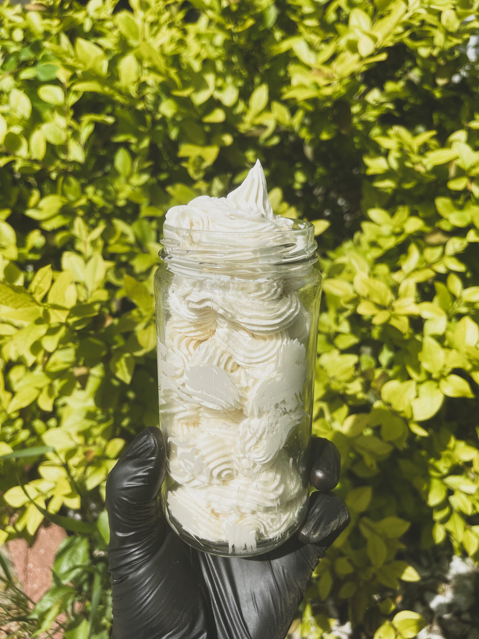 Whipped cream, but for your body! This body cream is super fluffy, hydrating, and non-greasy. Formulated to literally melt onto your skin; the rich butters and oils will give you the perfect glow while eliminating stretch marks, fading scars, soothing irritation/redness, and much more. Available in unscented, rose, jasmine, and vanilla.
